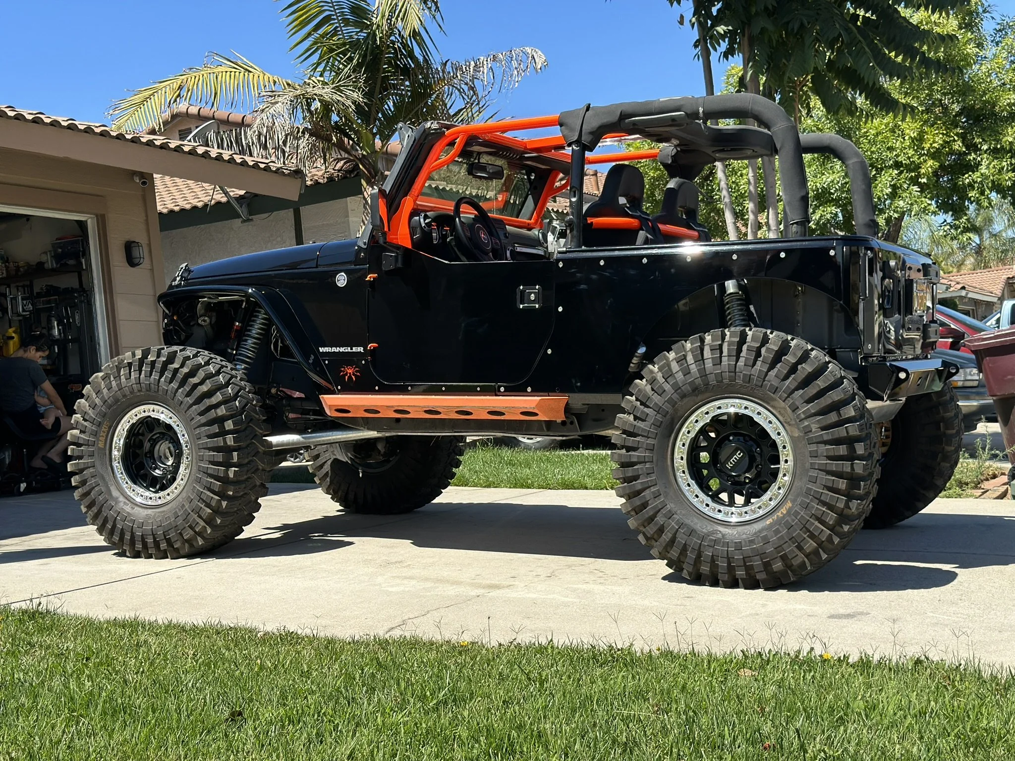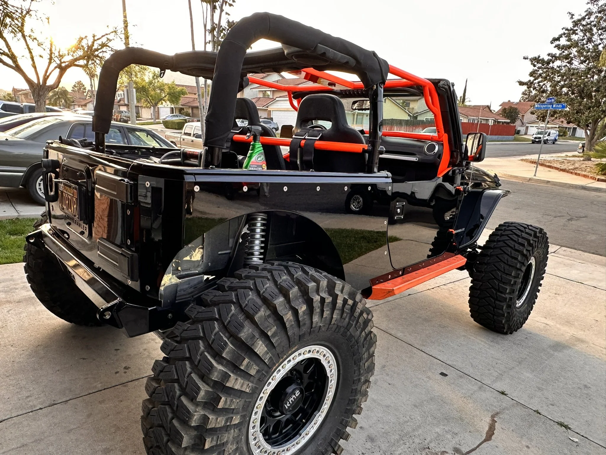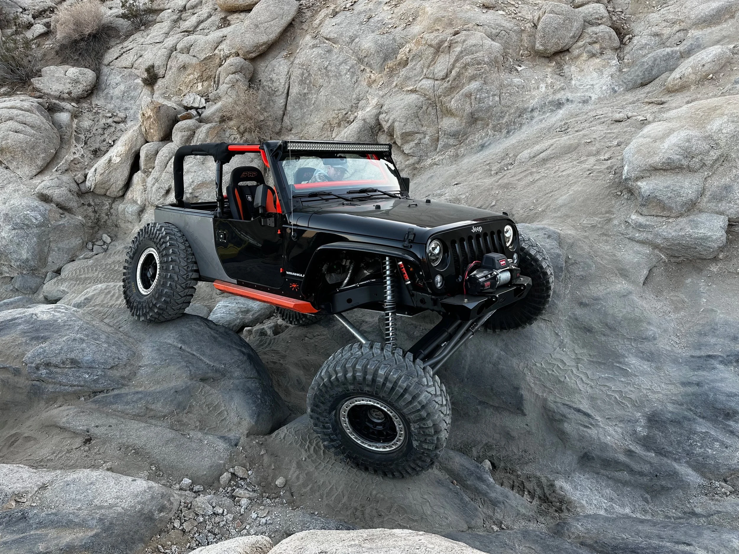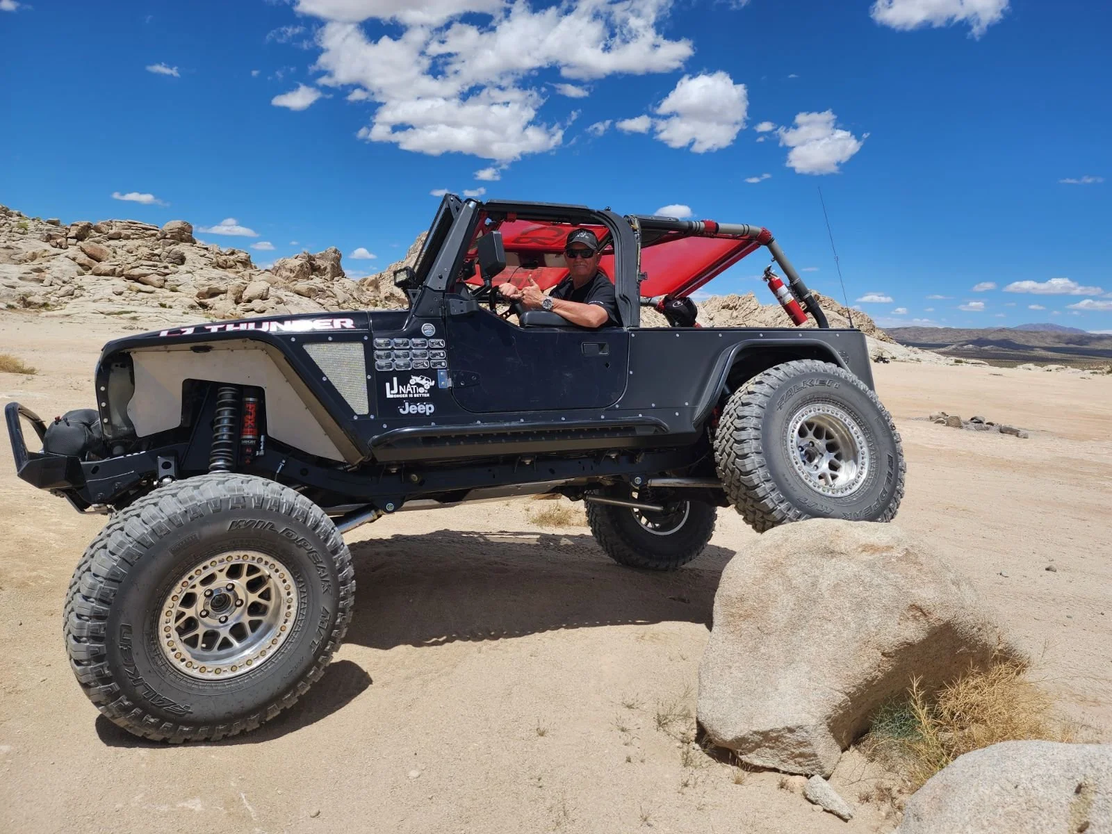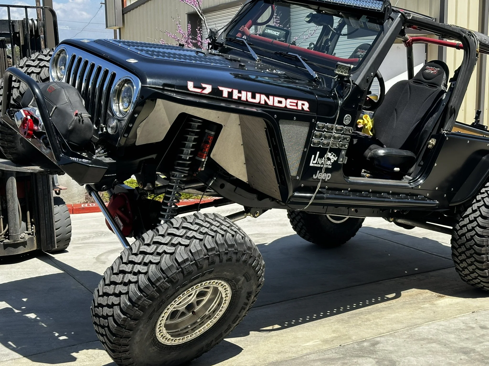 Jay Randall’s LJ is simple but checks all the boxes, Low LCG, Wider than stock, 12” coilovers front and rear, hydraulic bumps, all the armor and hydraulic assist steering.