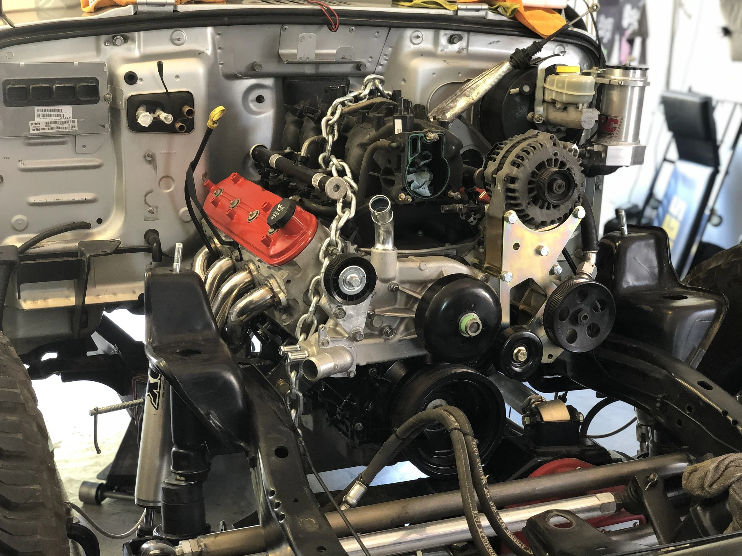 5.3 LS based truck motor, 4L65E transmission with a 4.3:1 Atlas 2 transfercase, all controlled by a Holley Terminator X Max.